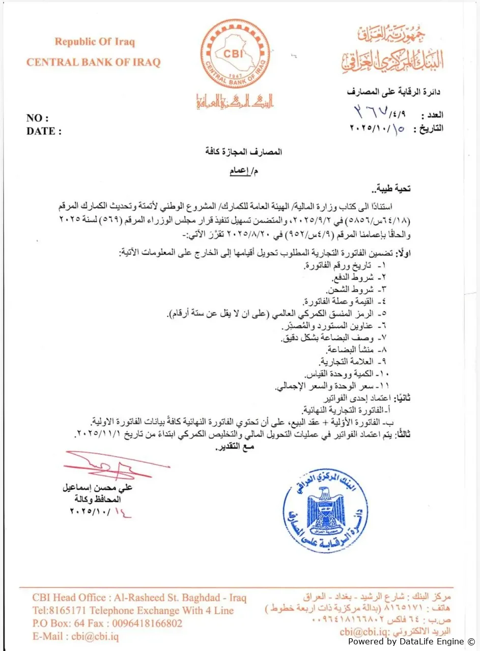 أصدر البنك المركزي العراقي، اليوم السبت، ضوابط جديدة موجهة إلى المصارف المجازة، تهدف إلى ضبط عمليات تهريب العملة الأجنبية إلى الخارج وتعزيز إجراءات الشفافية في التحويلات المالية والتعاملات التجارية.