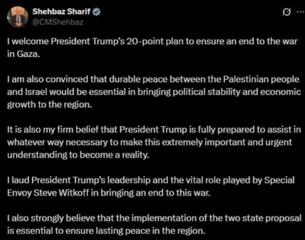 رئيس الوزراء الباكستاني شهباز شريف:أرحب بخطة الرئيس ترامب المكونة من عشرين نقطة لضمان إنهاء الحرب في غزة